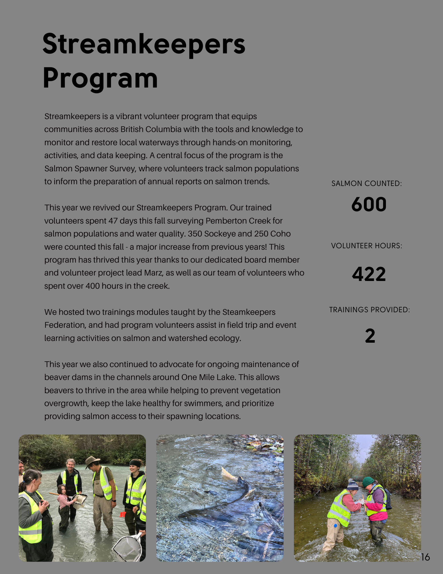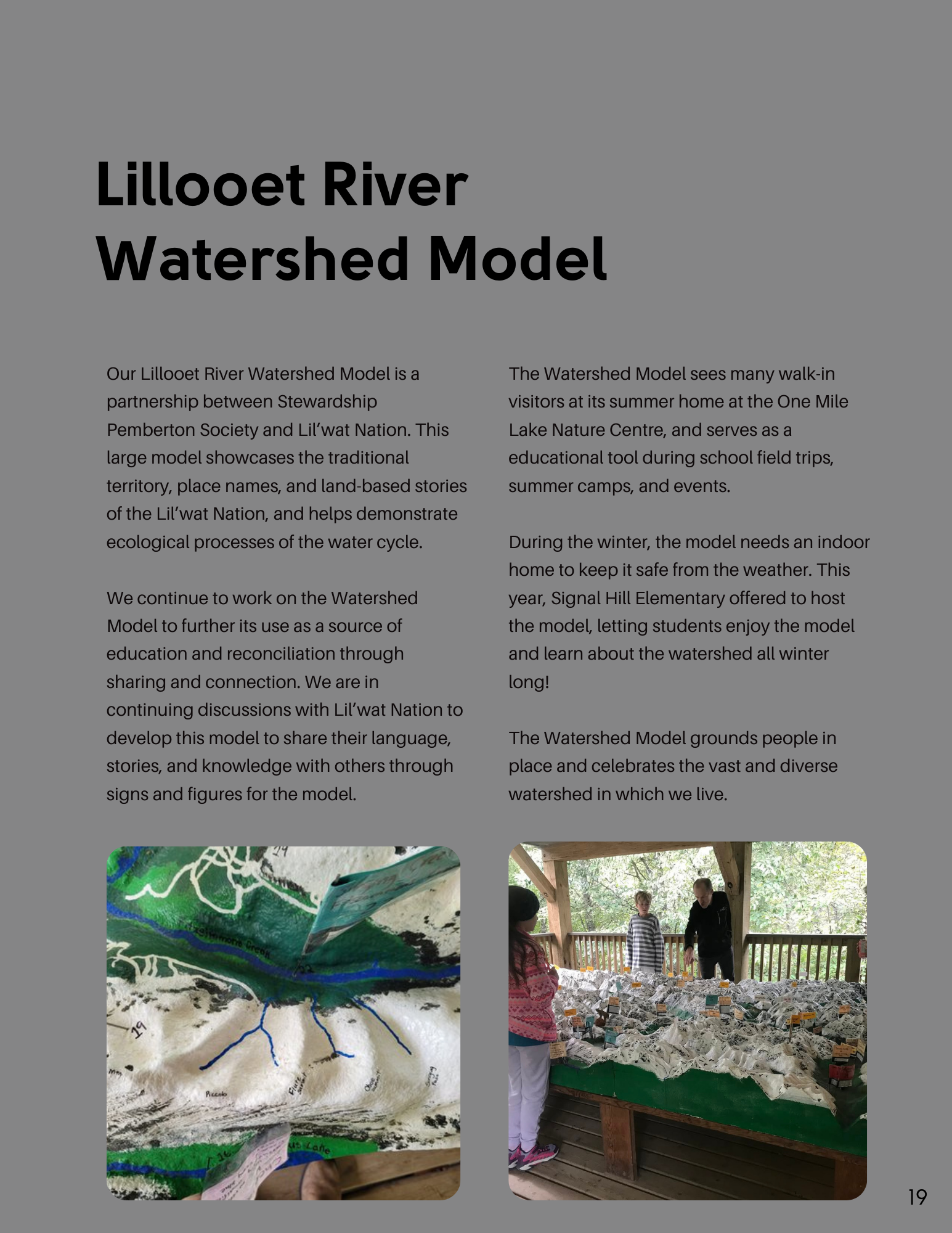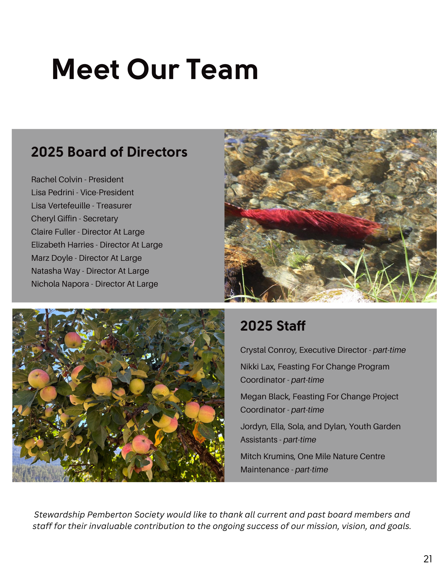 Stewardship Pemberton Society is an environmental non-profit and charity that is dedicated to the local environment and community. Our work is made possible through the generosity of our board of directors, volunteers, staff, funders, and community.