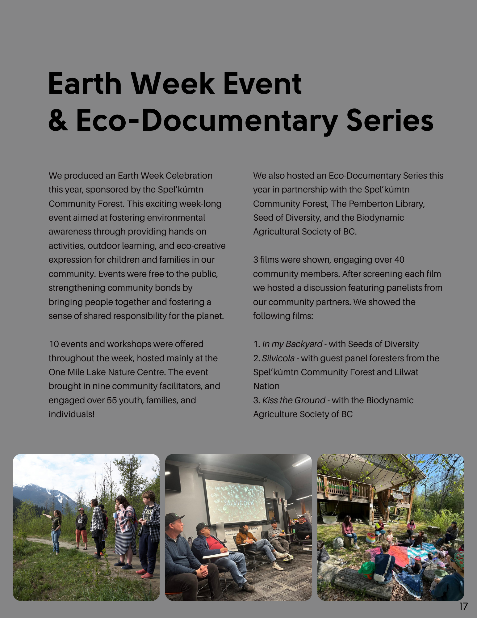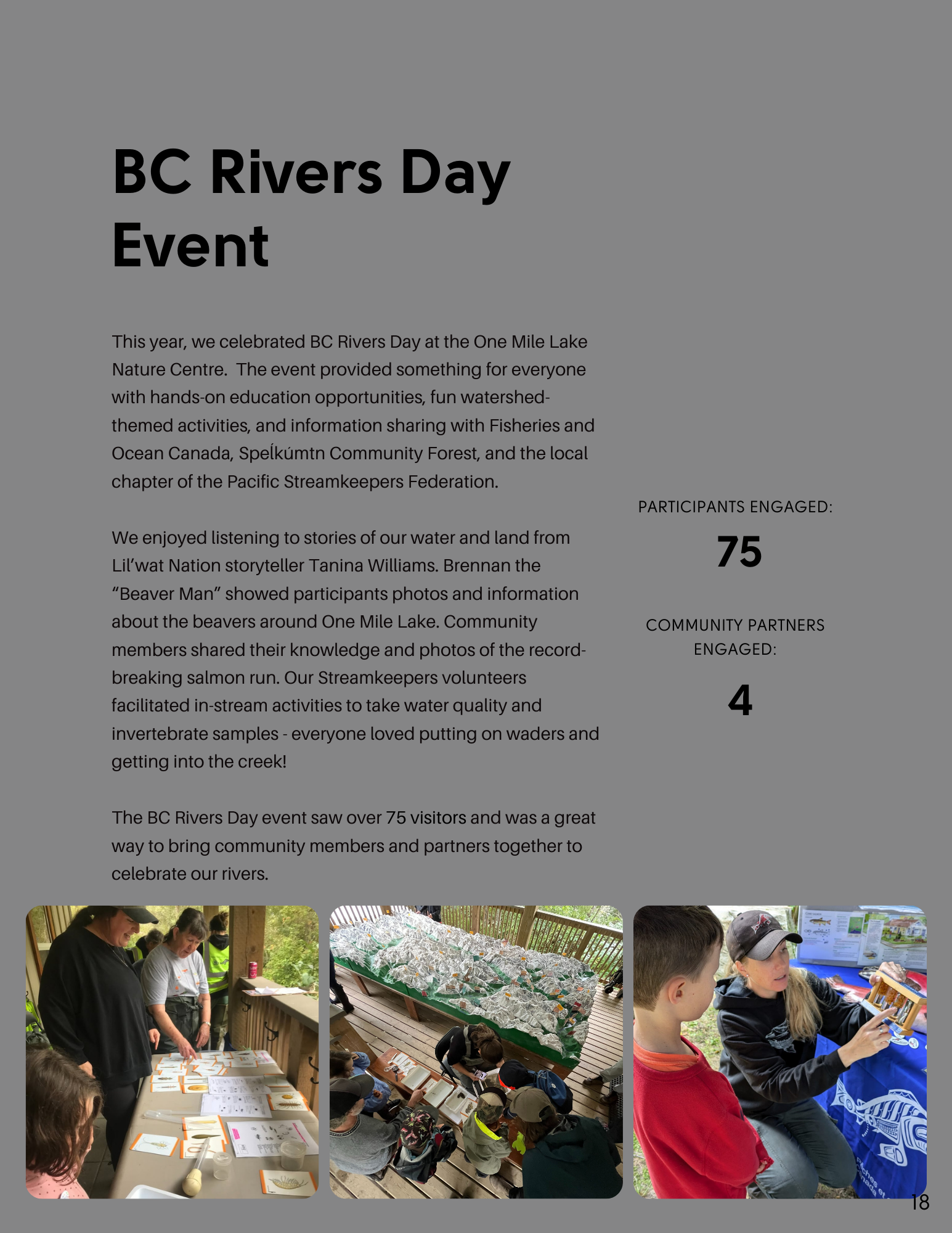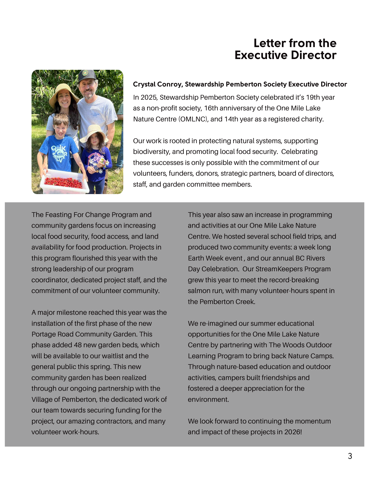 Stewardship Pemberton Society is an environmental non-profit and charity that is dedicated to the local environment and community. Our work is made possible through the generosity of our board of directors, volunteers, staff, funders, and community.